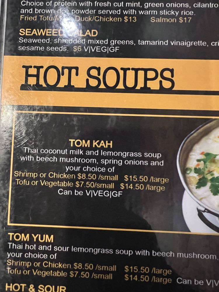 THAI COCONUT MILK AND LEMONGRASS SOUP WITH BEECH MUSHROOM, SPRING ONIONS AND YOUR CHOICE OF PROTEINCAN BE V|VEG|GF